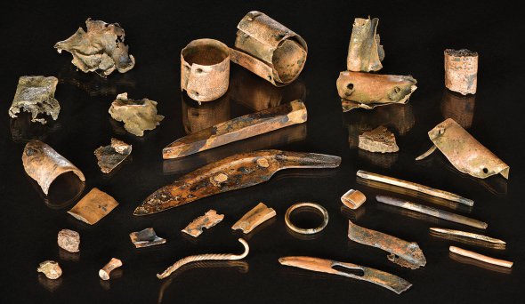 У збірці 31 об'єкт - бронзове шило з березовим руків'ям, вигнутий серповидний ніж, зубило, фрагменти бронзового листа, шматочки бронзового брухту, прикрашена зірками коробка з поясом, 3 прищіпки та бронзова спіраль. Їх знайшли у руслі річки на ділянці Weltzin 28. Призначення деяких невідоме. Раніше тут відшукали бронзові інструменти, шпильки та наконечники стріл, повідомляє The History Blog.