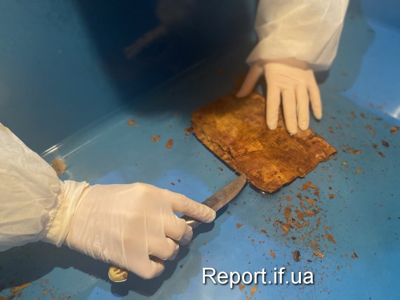 "Отут вона вже добре проглядається. Але ще залишимо відмокнути, бо цей згорток сильно пошкоджений іржею, і вона зробила його твердішим", - каже дослідниця.