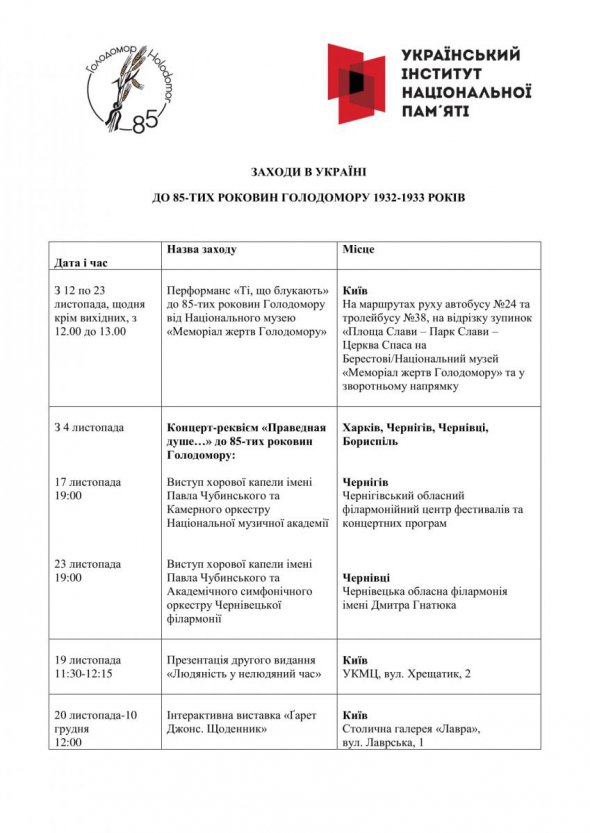 24 листопада, у 85-ті роковини Голодомору пройде міжнародна акція "Запали свічку пам'яті", Міжнародний форум "Україна пам'ятає, світ визнає", меморіальне засідання Верховної ради України та відкриття виставки "Україна 1932-1933. Геноцид голодом".
