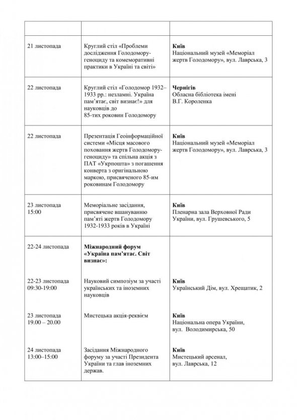 22-24 листопада у столиці пройде Міжнародний форум "Україна пам'ятає, світ визнає!". Він має на меті об'єднати зусилля міжнародної спільноти у визнанні Голодомору актом геноциду. Захід включає проведення наукового симпозіуму в Українському домі, Мистецької акції-реквієму в Національній опері України, а також засідання Міжнародного форуму за участі президента України та глав іноземних держав.