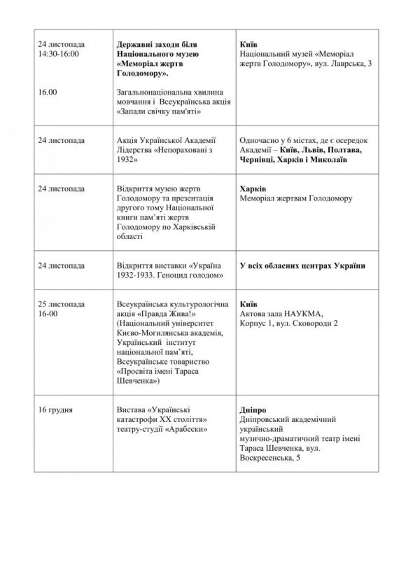 До Дня пам'яті жертв Голодомору відбудуться заходи на державному рівні. У столичному Оперному театорі відбудеться мистецька акція, організована Міністерством культури. Пам'ятні заходи за участі президента пройдуть у Мистецькому Арсеналі та о 16:00 біля Меморіалу жертвам Голодоморів. 23 листопада о 15:00 у Верховній Раді відбудеться меморіальна сесія, присвячена пам'яті жертв Голодомору.