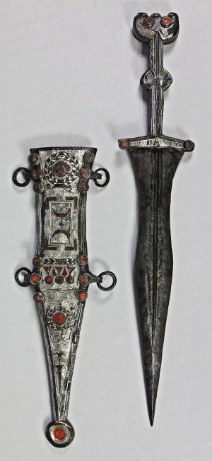 Кинджал прикрашено переважно спереду. Має безліч срібних ліній та малюнків листя, вкраплених у залізо. Товщина срібних ниток складає лише 0,15-0,2 мм. Крім того, кинджал містить вставки з червоної емалі і червоного скла. Встановлено, що емаль являє собою суміш різних мінералів, які плавляться тільки за дуже високих температур, утворюючи склоподібний матеріал. Лезо зброї виготовили з різних видів сталі, зварених між собою.