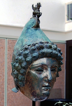 Він являє собою частину типового церемоніального обладунку, що застосовувався під час турнірів "hippika gymnasia". Його лицьова частина зображує юнака, одягненого в фрігійський ковпак. У його верхній частині розміщується фігурка грифона, що є незвичним атрибутом для подібних шоломів. Є припущення, що шолом зображує бога Митру, популярного в римській армії в перші століття нашої ери.