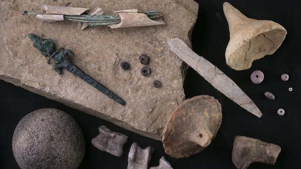 Під час розкопок виявили бронзові голки і статуетки різних божеств, гральні кубики з кісток і залізний кинджал.