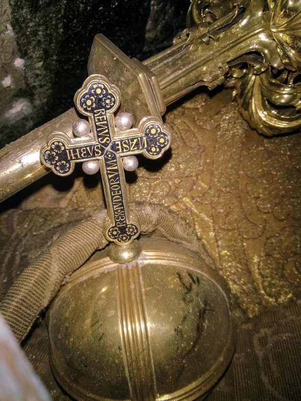 Окрім символів влади над підданими, у могилі побачили карбовані монети, велике розп'яття із статуеткою Ісуса та залишки матерії.