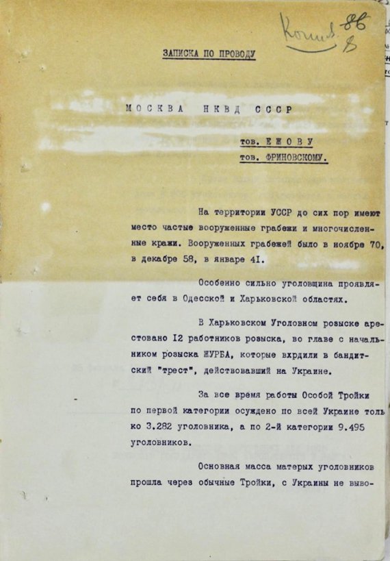 "Нарком внутрішніх справ України Успенський пише Єжову і Фріновському в Москву в лютому 1938 року: мовляв, у нас чогось кримінальників багато сидить по тюрмах - давайте їм терміни швиденько на розстріл перепишемо - не по дорозі нам з ними в світле майбутнє. На 8 тисяч чоловік. Ну для рівного рахунку на 10 тисяч. А Фріновський йому строго відповідає: ми вам вже ліміт давали на 6 тисяч осіб, а зараз ще на 30 тисяч розстрілів даємо", - пише історик.