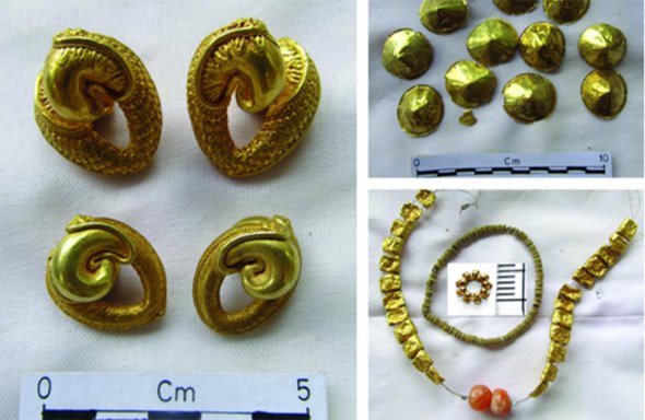 Всього за ці роки археологи виявили 4 саркофаги з ритуальними предметами всередині. Серед них: намистини з черепашок та кольорового скла, бронзовий барабан, 43 римські позолочені намистини та прикраси із сусального золота, 2 пари підвісок із чистого золота та 2 китайських бронзових дзеркала. Більшість предметів, окрім дзеркал, походять із римського Єгипту.