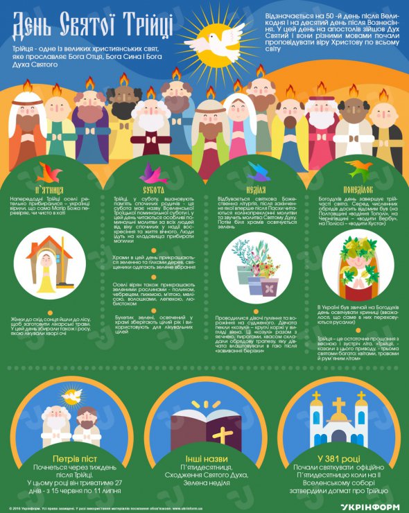 Святкують через 50 днів після Великодня. Звідси й ще одна назва свята – П'ятидесятниця. У цьому році дата свята збіглася як у католиків, так і у православних.