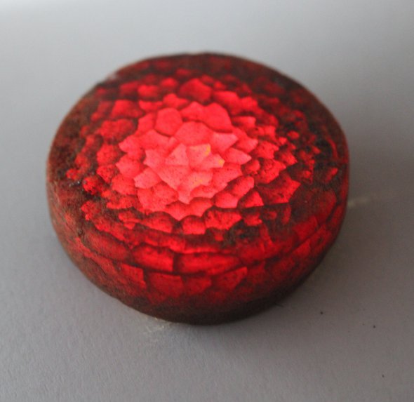 Знахідка стала першою в Данії. Має розмір 3 см і товщину 0,9 см. Дослідників вразила її тонка обробка. Коли через грані проходить світло, диск сяє червоним вогнем. Спеціалісти встановили, що предмет помістили до праху підлітка.
