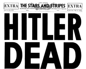 30 квітня 1945 року фюрер Німеччини і його дружина Єва Браун закінчили життя самогубством. За день до того вони одружилися. Вранці він дізнався про смерть свого соратника Беніто Мусоліні. Тіло якого разом з його коханкою було знівечене й повішене на площі Мілану. Фюрер прийняв рішення. Гітлер зробив постріл у скроню з власного пістолета, а Браун отруїлась ціаністим калієм. Згідно з останньою волею фюрера тіла були винесені з бункера в сад канцелярії рейху, облиті бензином і підпалені; о 18-30 їх останки були закопані поряд у неглибокій воронці від бомби. 1 травня про смерть Адольфа Гітлера по радіо оголосили всьому світові.