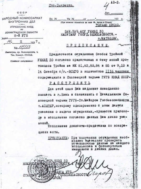 Особлива трійка УНКВД Ленінградської області почала підписувати вироки в'язням Соловецького етапу 9 жовтня 1937 року. Протягом 5 діб чекісти засудили до розстрілу 1116 осіб.