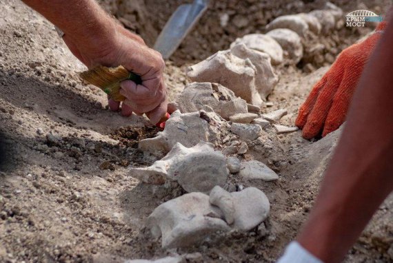 "Фрагменти скелета - хребетний стовп і ребра - були знайдені в ході археологічних досліджень, що передують будівництво залізниці-підходу до Керченського мосту. Скам'янілості залягали на невеликій глибині - близько метра від земної поверхні", - повідомляє інфоцентр "Кримський міст".
