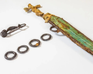 Серед предметів були мідні браслети з геометричними візерунками, 18 фібул, одна з яких прикрашена кабошоном і срібною вставкою.