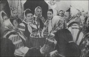 На діжі навхрест ліпили чотири свічі й із піснями вимішували тісто. Носили по хаті, піднімали над головою й підкидали до стелі, вдаряли об сволок — "щоб коровай високим і гарним удався".