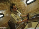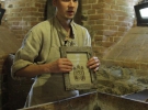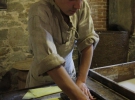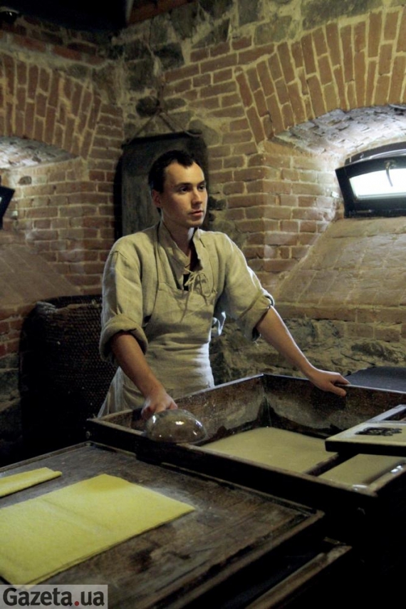 "На жаль, сучасний кримінально-процесуальний кодекс України не дозволяє використовувати коноплю. Замість неї ми беремо кропиву, - жартує хлопець. За мить він показуватиме, як папір виготовляли, - Але технологію виготовлення паперу це не змінює. Волокна кропиви — майже ті самі. Те, із чого робитимуть папір, треба було спершу висушити протягом кількох днів. Потім складники відварювали, знову відстоювали. Такий процес тривав місяцями. В результаті отримували пульпу — рідину білуватого кольору. Аби маса лишилася однорідною і не стала на дні, її треба постійно підмішувати".