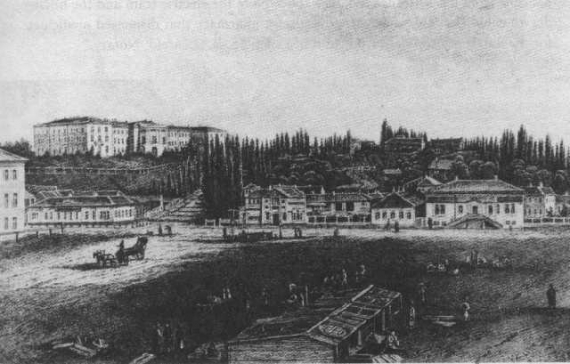 До 1871 року на площі, що називалася в той час Хрещатицькою, розміщувався ярмарок, відбувалися циркові вистави та народні гуляння. Перша велика цегляна будівля була споруджена в 1851 році.