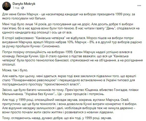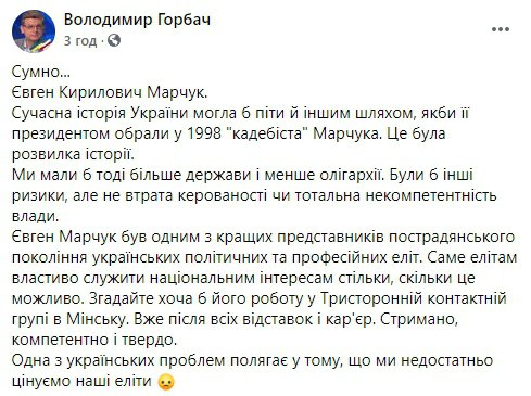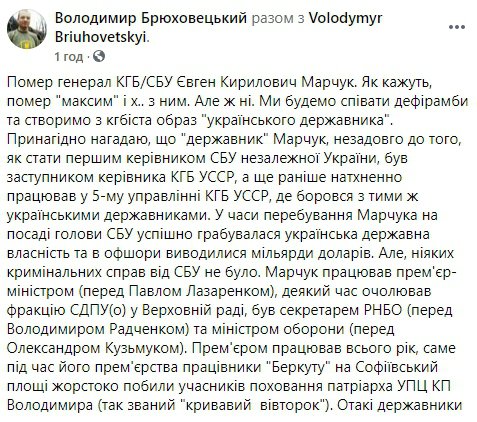 "Він був першим українським прем'єром, який викликав гордість - розумний, патріотичний, із блискучим знанням англійської мови, а до всього - статний і вродливий. Він першим з українських політиків такого рангу викликав довіру й симпатію на Заході. Не випадково його сприймали абсолютно позитивно більшість політиків - учорашніх радянських дисидентів і політв'язнів. Показово, що до Марчука з довірою ставилися лідери організованого націоналістичного руху, зокрема, останній Президент УНР в екзилі, Голова ОУН Микола Плав'юк", - пише у Facebook історик Сергій Кот.