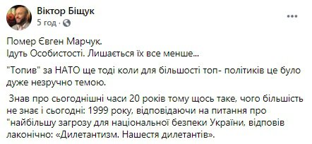 5 серпня помер колишній прем'єр-міністр, голова Служби безпеки України й міністр оборони Євген Марчук. Йому було 80 років.