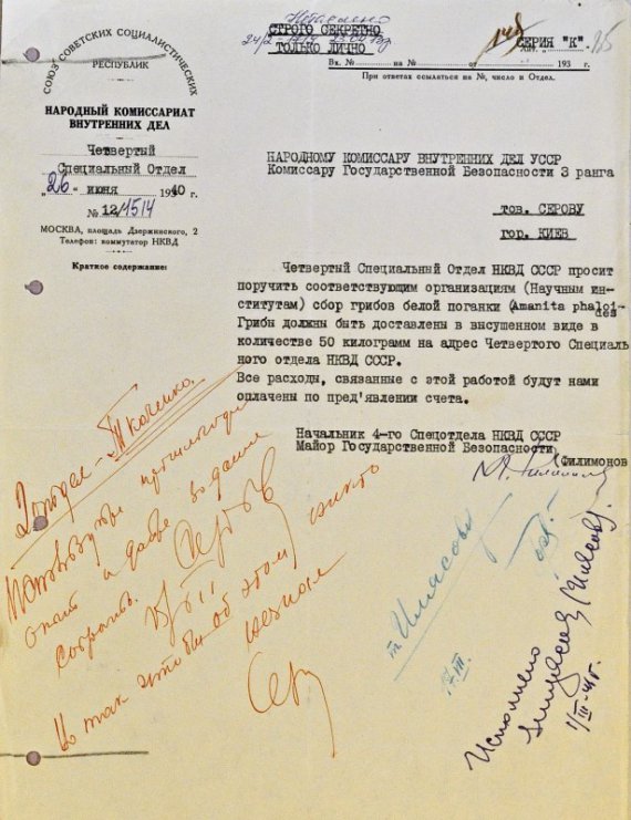 У ній розробляли отруту. Розсекречені документи вказують, що з України до Москви пересилали отруйні гриби для проведення дослідів. Документи опублікував користувач "Живого журналу" allin777.