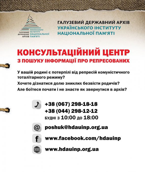 Галузевий державний архів Українського інституту національної пам'яті відкрив Консультаційний центр з пошуку інформації про репресованих у 1917-1991 роках осіб.