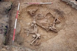 Спочатку історики вирішили, що поряд з трупом жінки був похований труп коня, але після аналізів з'ясувалося, що це була корова. Поховання відноситься до 5 століття, і раніше археологи знаходили спільні поховання того періоду людей з тваринами, але це були тільки чоловіки з кіньми.