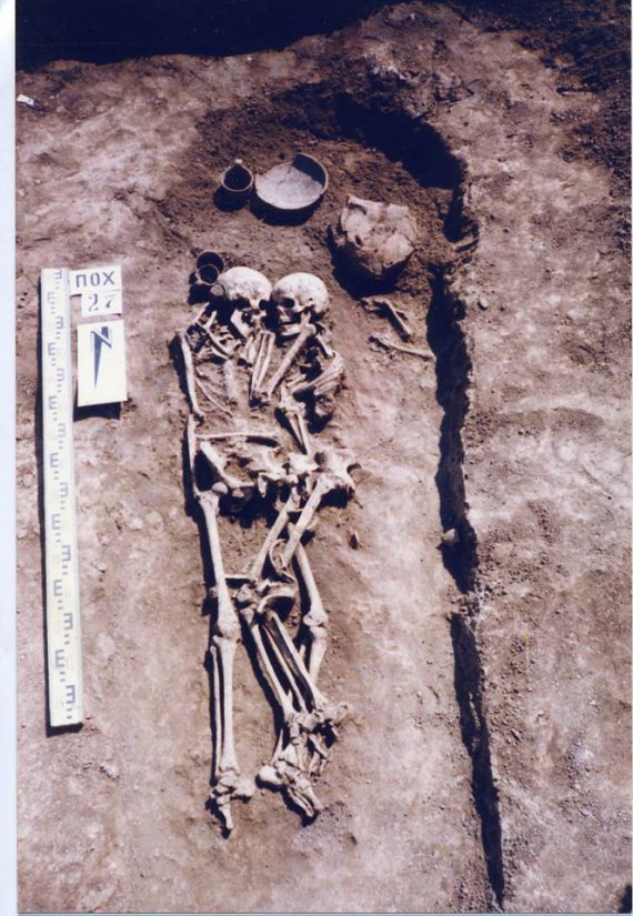 "Серед цих парних поховань у Петрикові одне унікальне: в могилі, міцно обнявшись, лежали чоловік і жінка. Обидвоє були звернені лицями до себе, торкаючись чолами одне одного. Жінка лежачи на боці, правою рукою ніжно пригорнула чоловіка до себе, поклавши зап'ястя своєї руки на його праве плече. Ноги жінки при цьому – міцно стулені і зігнуті в колінах, лежали поверх випростаних ніг чоловіка. На обидвох небіжчиках знаходилися бронзові прикраси, а в головах – розставлений півколом глиняний посуд: миска, горщик і три черпаки", - розповідає він.