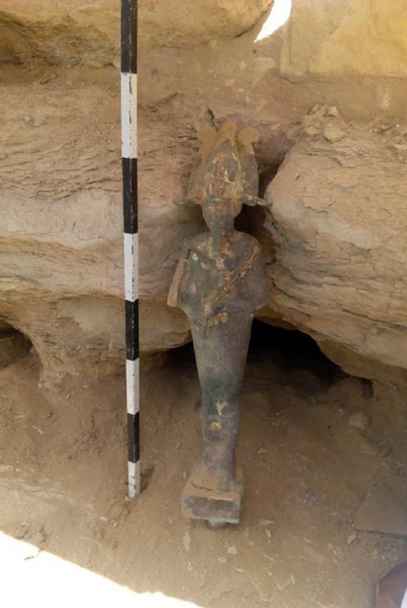 "Статуя була знайдена біля західного схилу піраміди, в щілини між кам'яними блоками, коли археологи почали розчищати піщані завали і прибирати сміття. На ній зображений Осіріс, бог підземного світу і відродження, що тримає в лівій руці перо, а в правій - скіпетр", - заявив Мустафа Вазірі, глава Вищої ради Єгипту у справах старовини.
