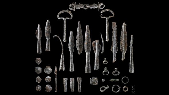 Усього із землі вдалося дістати близько 150 предметів - зламаних мечів, наконечників списів, стріл, гаків для ременів, елементів кінського спорядження тощо. Також знайшли три срібні монети, бронзові прикраси та людську кістку з нижньої частини гомілки, повідомляє Live Science.