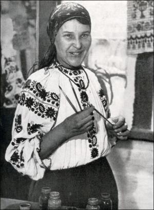 Примаченків ми застали за роботою. Марія Оксентівна виводила малим пензликом жовті квіти на аркуші. Невістка Катерина мережила наволочки — вона працювала вдома від фабрики художніх виробів. А перед Федором лежав щойно розписаний таріль.