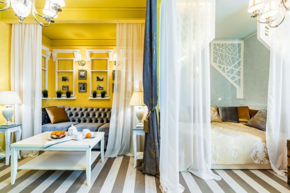 Зонування шторами може бути не тільки функціональним, але і для прикрашання. Їх легко вішати, займають мало місця і коштують дешевше, ніж стінку поставити.