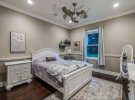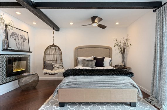 На досить прохолодному тлі білих стін розташовують дуже затишні предмети інтер'єру. У спальні цього дизайну завжди присутні вовняні або лляні тканини, плетені елементи (кошика для журналів і книг біля ліжка, наприклад або килимки-циновки), живі рослини, декоративні елементи, зроблені своїми руками (головне - не переборщити з кількістю і вчасно зупинитися, щоб не перевантажити образ спального приміщення).