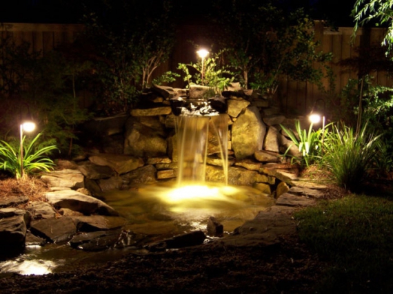 Для більшої оригінальності варто оформити біля водопаду підсвітку. Вона створить романтичний настрій.