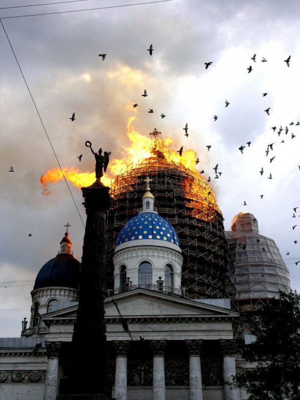 5. Троїце-Ізмайловський собор у Санкт-Петербурзі. Роком його будівництва є 1835. Вогнем собор охопило 25 серпня 2006 року. У результаті згорів головний і 2 малі куполи. Зачепило також і внутрішнє оздоблення святині. Загоряння сталося в ході реставраційних робіт — спалахнуло риштування. На усунення наслідків пожежі пішло 11 років. Офіційної причини інциденту так і не було названо.