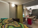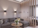 3. Урізноманітнити дизайн і візуально розділити кімнату на зони можна за допомогою освітлення. Тут найкраще справляться вбудовані стельові світильники. Для створення більш затишної атмосфери знадобляться лампочки з теплим жовтим світлом.