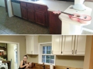 Оновити старомодну кухню можна вдало пофарбувавши. Підлогу прикрили килимом з яскравим візерунком.