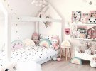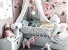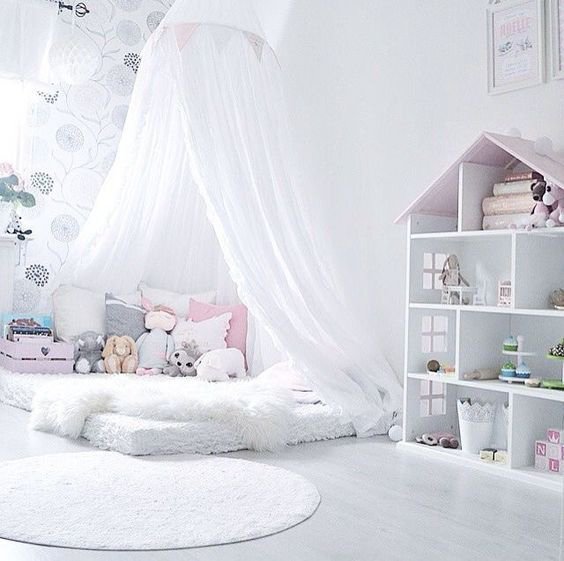 Обо'язково в дитячій має бути дзеркало, невеликий стілець і письмовий стіл, низькі полиці, ігрові килимки. Іграшки слід підбирати такі, щоб одразу захоплювали увагу малечі й розвивали уяву. Ліжко для маленьких дітей варто облаштувати на рівні підлоги, аби була можливість без допомоги на нього залазити. Це дозволить виховати в дитині самостійність. Відповідну підбірку ідей для оформлення дівочої дитячої подав фото-сервіс pinterest.