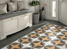 Плитка контрастного відтінку викладена у формі килима підходить для оформлення підлоги передпокою або вітальні. Вона створює ефектні переходи і ілюзію змішування різних фактур.