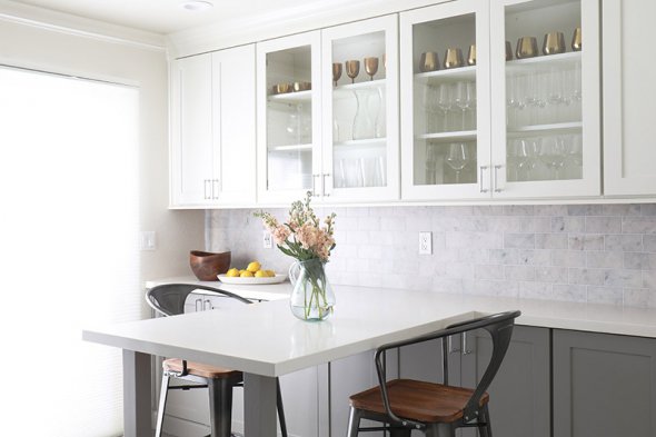 6. Шафи зі скляними дверцятами. Такі моделі візуально розширюють простір, виглядають стильно й елегантно. Дозволяють виставляти напоказ посуд і предмети декору так, щоб на їхній поверхні не накопичувалися пил і жир.
