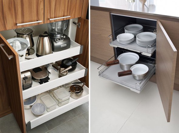5. Висувні полички. Наявність у тумбах таких елементів дозволяє зберігати кухонне приладдя, не захаращуючи простір.
