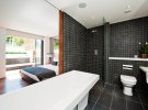 Білосніжна ванна виглядає дуже ефектно на тлі чорної плитки. Це створює оригінальний стриманий інтер'єр, а теплі відтінки бадьорять.
