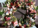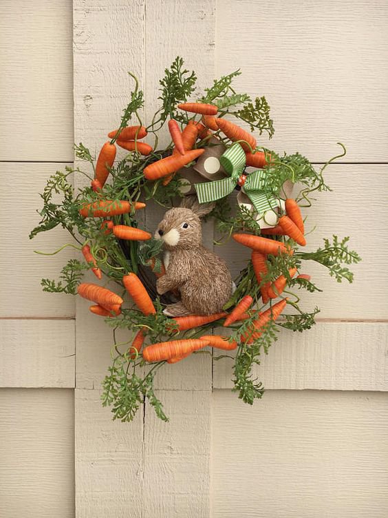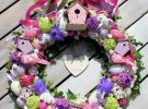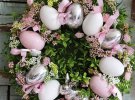 Ошатний вінок на дверях – святковий символ тепла і єднання. Тому він став настільки трендовим останні кілька років на Великодень. Класичною кольоровою гамою є білі і яскраво-жовті весняні квіти. До них можна додати декоративні яйця, гілки дерев, стрічки, іграшки, пластмасові квіти та різноманітні предмети декору.