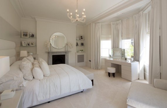 Штори в білій спальні також можуть виступати як акцентної деталлю, так і підходити до основної колірної гамми. Саме білі штори - сміливе рішення, однак, якщо правильно обіграти їх в інтер'єрі, вони будуть виглядати розкішно і стильно. Для того, щоб білі штори не нагадували про лікарняній палаті - розбавте їх спокійних або темних відтінків гардинами. Відносно принта також варто задуматися - можливо, це може стати яскравим, цікавим акцентом в кімнаті.