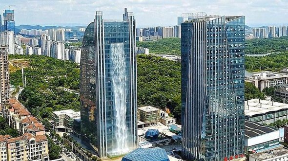 У китайському місті Гуйян відкрили хмарочос із найбільшим штучним водоспадом у світі. Його висота сягає 108 м. Водоспад запускають 4 насоси, а воду збирають у величезному резервуарі на землі.
