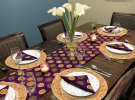 Ще один цікавий спосіб застелити стіл - розташувати доріжку для двох людей, що сидять один навпроти одного, поперек. Інші вироби повинні розміщуватися на відстані, щоб поверхня не виглядала перевантаженою. Між ними привабливо виглядатимуть квіти у вазах або свічки.