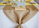 Натуральний матеріал - мішковина - чудово виглядає на дерев'яній стільниці, підкреслюючи її природну текстуру. Щоб пом'якшити її брутальність мішковини, поєднують з атласними стрічками та контрастним мереживом.