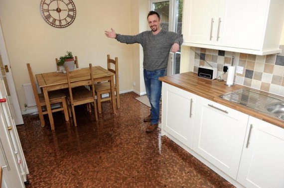 36-річний англієць Метт Джайлс підлогу виклав із монет. Йому ця ідея прийшла в голову несподівано. Він наткнувся в інтернеті на дизайнерські вироби з монет.