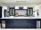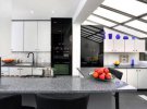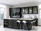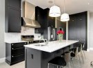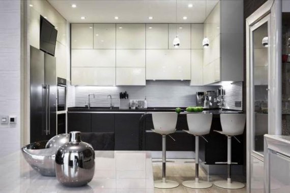Кухня у чорно-білих тонах виглядає стильно та вишукано. Дзеркальні і скляні вставки в кухонних шафках – прекрасна ідея дизайнера, яка візуально полегшує сприйняття темного кольору меблів.