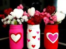 Пляшки можна перефарбувати у різні відтінки, додати блискіток і декоративних стрічок. Контрастними кольорами додайте сердечка і надписи про кохання. У таку пляшку гарно поставити гілку або свічку.