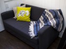 Спальню було вирішено зробити під стелею, щоб не економити на ширині та довжині ліжка. У міні-вітальні диван може розкладатися на всю довжину, щоб там могли з'являться гості.