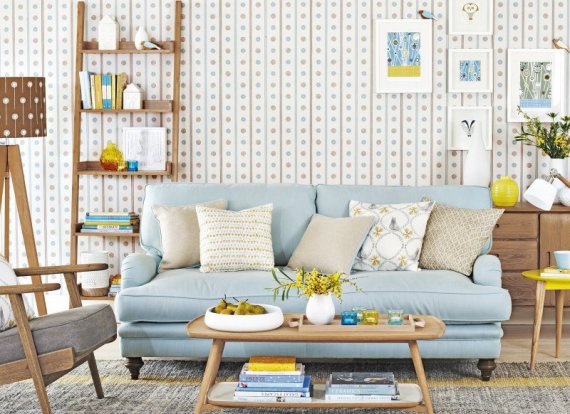 Освітлення. Для вітальні з вікнами на південну сторону підійдуть шпалери в контрастних холодних відтінках: сірий, блакитний або зелений.